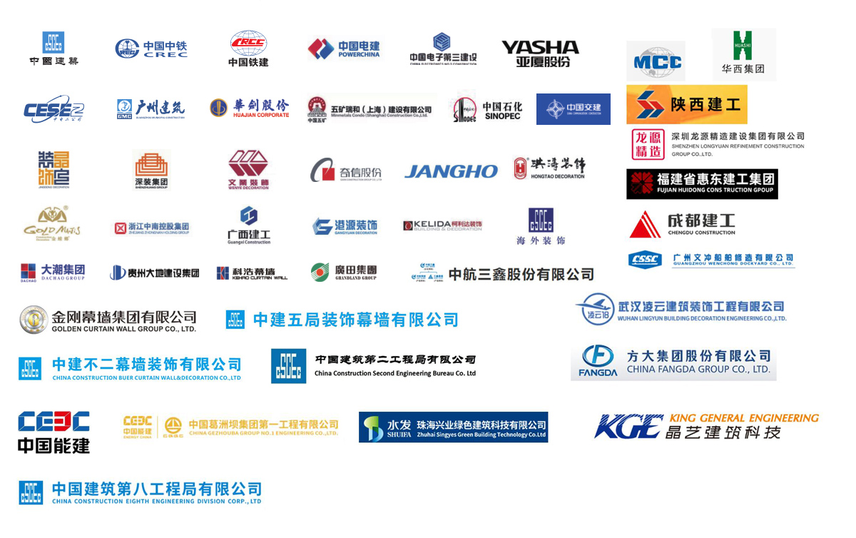 公司參建了諸多大型項目工程,如港珠澳大橋、珠海國際航展、深圳國際會展中心、廣州白云機(jī)場、西安全運(yùn)會場館、成都東安湖大運(yùn)會場館、樂山奧體中心、洛陽奧體中心、增城富士康廠房、惠州中海油、陽江核電站、珠三角各地鐵線、高鐵站、廣西桂林機(jī)場、廣西柳州文化廣場、四川成都天府機(jī)場、海南海口美蘭機(jī)場、西安絲路會展中心、惠州北站等等。與中國建筑、中國中鐵、中國鐵建、中國電建、中國交建、中國中冶、中國能建、廣東建筑、廣西建工、廣州建筑等大型國有企業(yè)下屬公司及江河幕墻、金螳螂裝飾等各大建筑裝飾、幕墻裝飾公司達(dá)成長期友好合作關(guān)系。